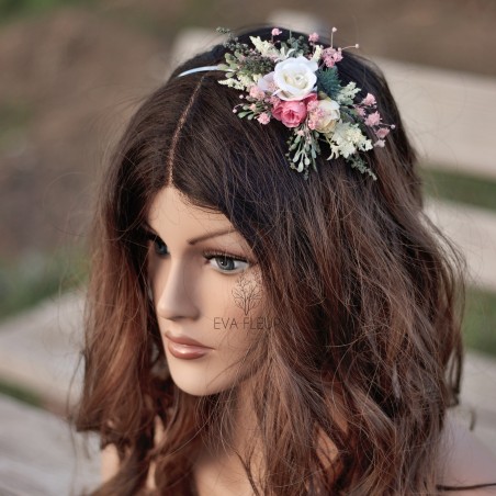 kovová květinová čelenka s umělými a konzervovanými květinami