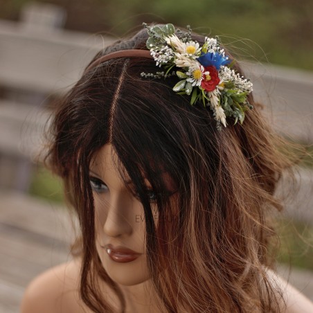 látkové květy, umělá zeleň, sušené obilí, konzervovaný nevěstin závoj, konzervované barvené stoebe