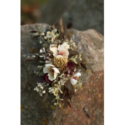 francouzská kovová květinová spona do vlasů zdobená umělými, sušenými příp. stabilizovanými květy pro svatební a jiné události, focení atp.