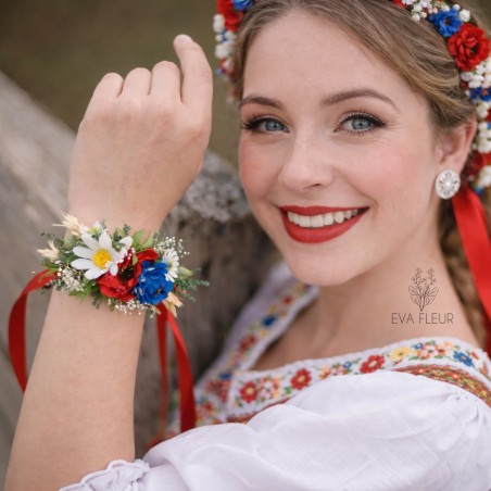 látkové květy, umělá zeleň, sušené obilí, konzervovaný nevěstin závoj, konzervované barvené stoebe