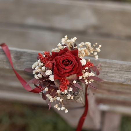 látková růže, růžičky z morušového papíru, umělý eukalyptus, konzervovaný materiál: dobarvovaný eukalyptus nicoly, nevěstin závoj, sušený barvený čirok