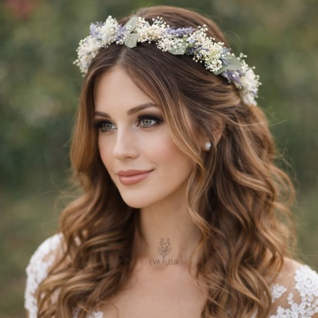 umělá levandule, umělé bílé kvítky a zeleň, konzervovaný dobarvovaný eukalyptus, bělená konzervovaná gypsophilla